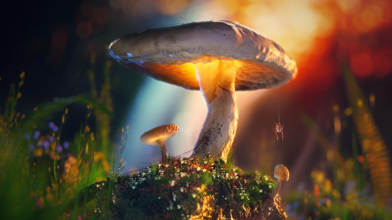 Обои Паук висит на паутине на грибе
