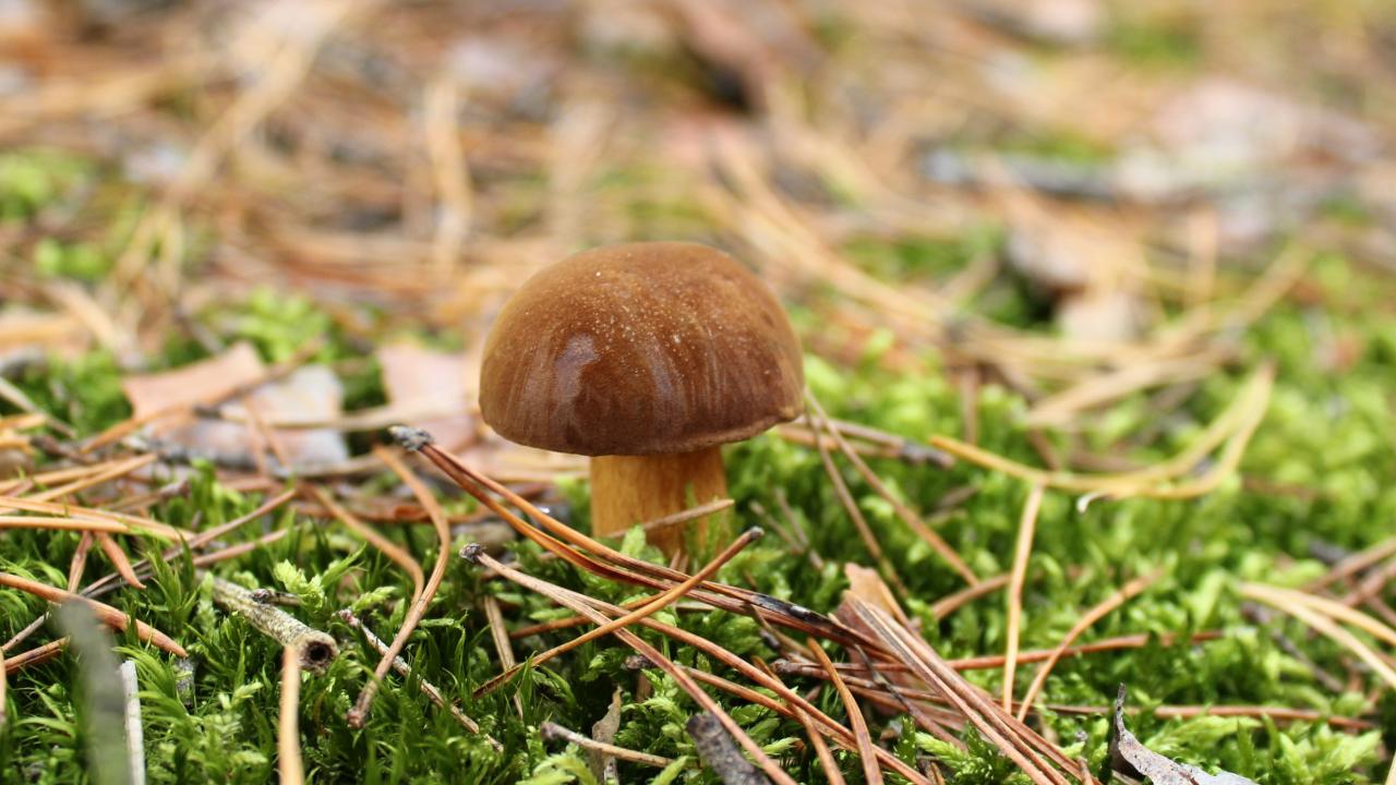 Обои Гриб растет на покрытой зеленым мхом траве