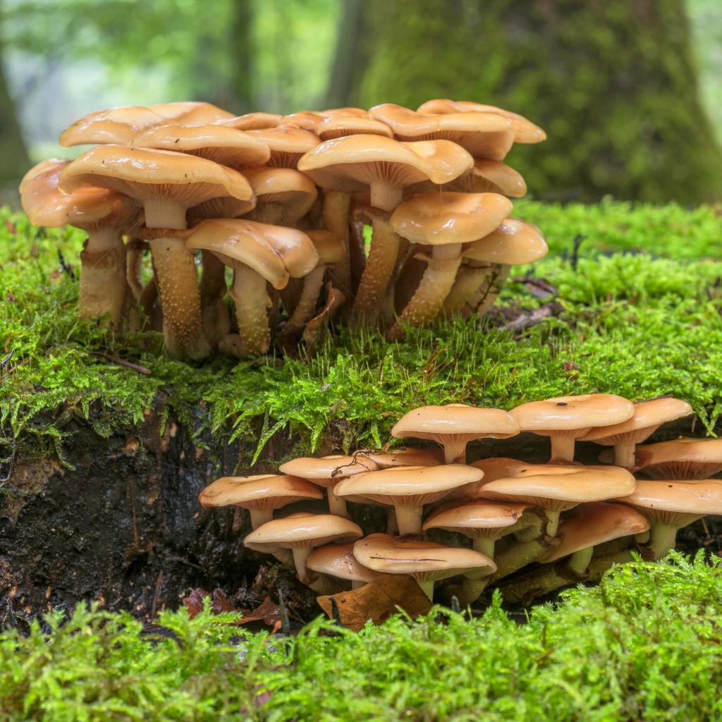 Обои Лесные грибы на покрытой мхом земле