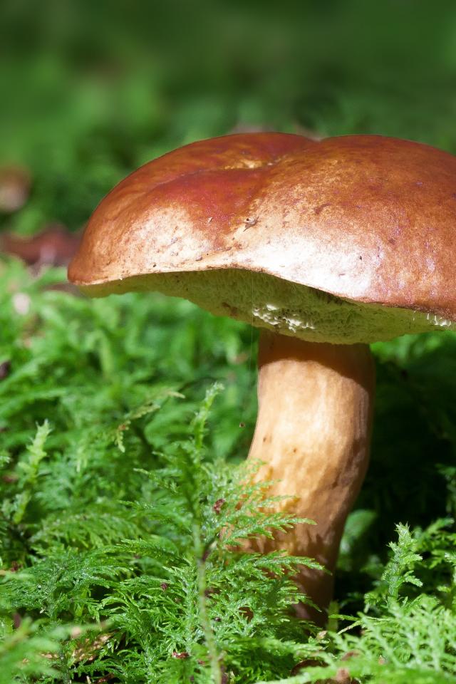Обои Большой польский гриб на покрытой мхом земле