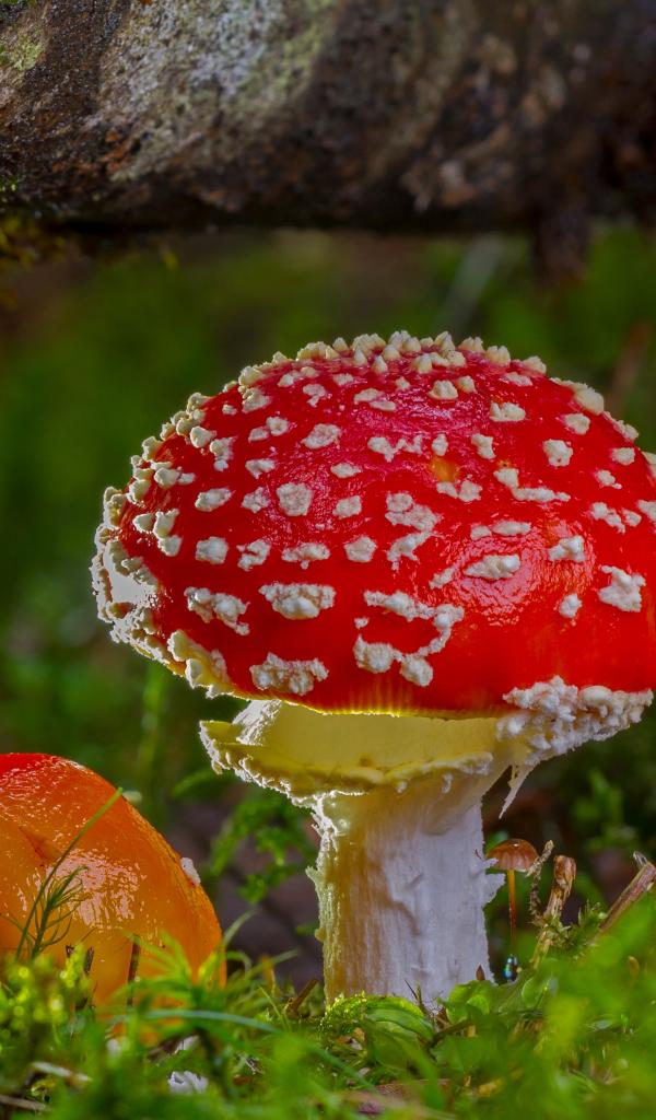 Обои Яркие красные грибы мухоморы под корягой в лесу