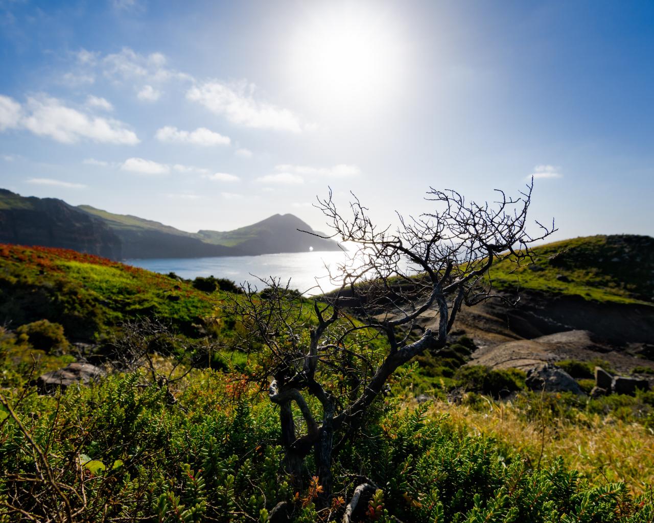 Обои Зеленые утесы у моря на фоне яркого солнца