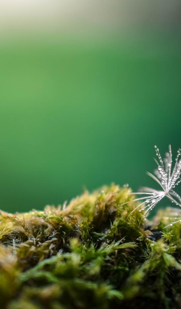 Обои Белые семена одуванчика на покрытой мхом земле