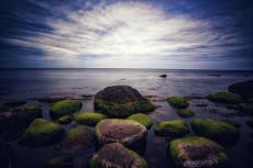 Обои Большие мокрые камни с мхом в реке