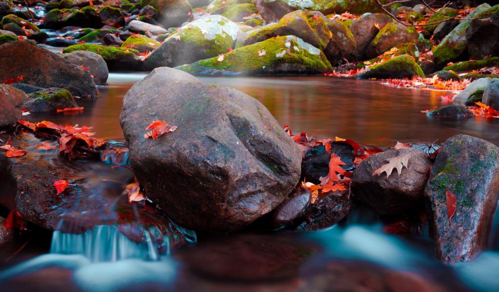 Обои Большие мокрые камни с мхом в реке