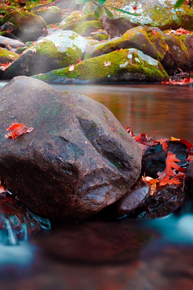 Обои Большие мокрые камни с мхом в реке