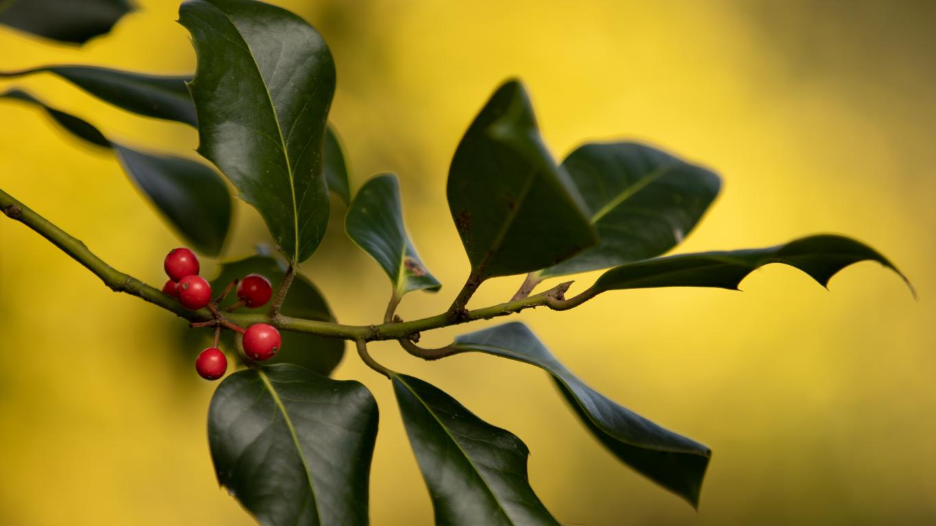 Обои Красные ягоды на ветке с зелеными листьями