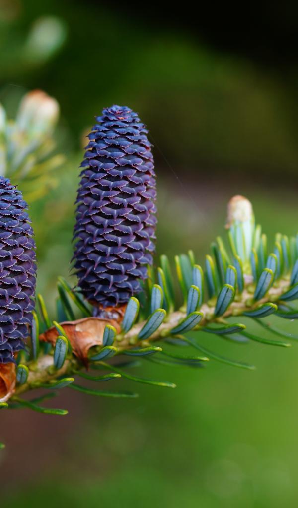 Обои Две голубые шишки на ветке зеленой ели