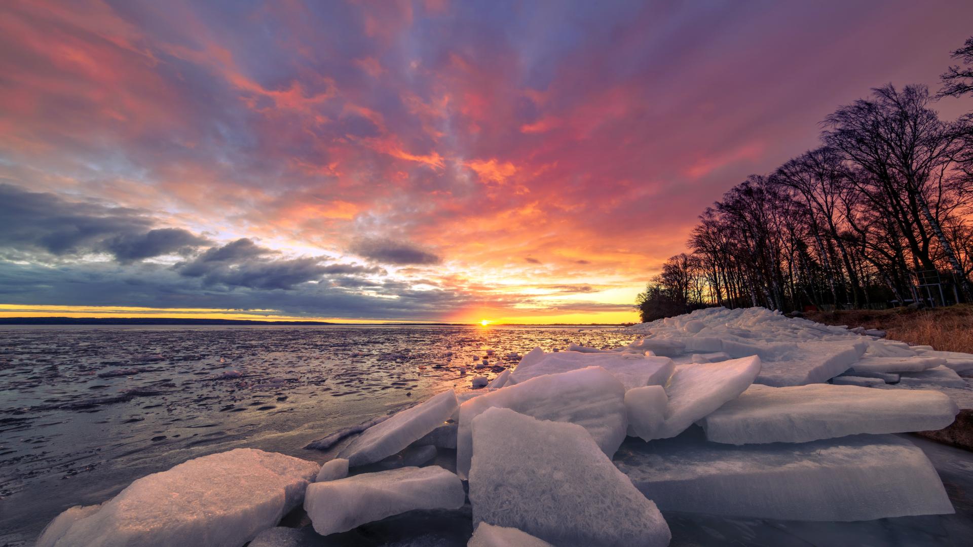 Обои Глыбы льда лежат на берегу моря на закате