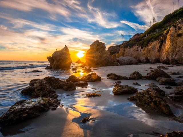 Обои Яркий рассвет летнего солнца над скалами и океана
