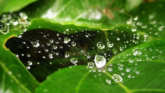 Обои Мокрая паутина на зеленом листе