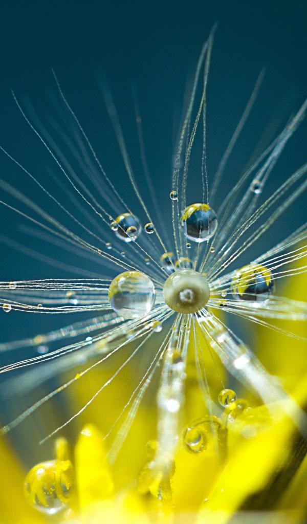 Обои Белые семена одуванчика в каплях росы крупным планом