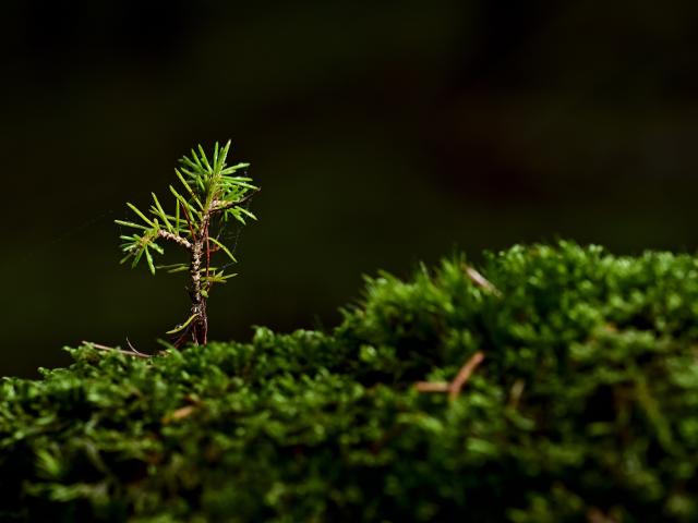 Обои Маленькая растущая ель на покрытой мхом земле