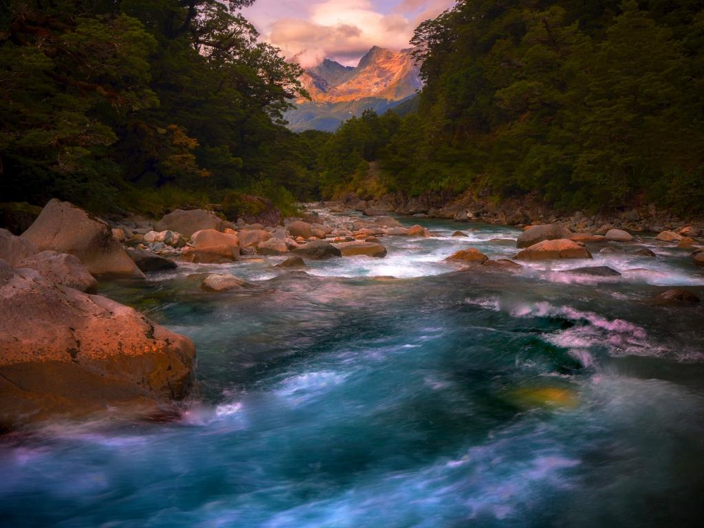 Обои Быстрая вода в горной реке с маленьким водопадом