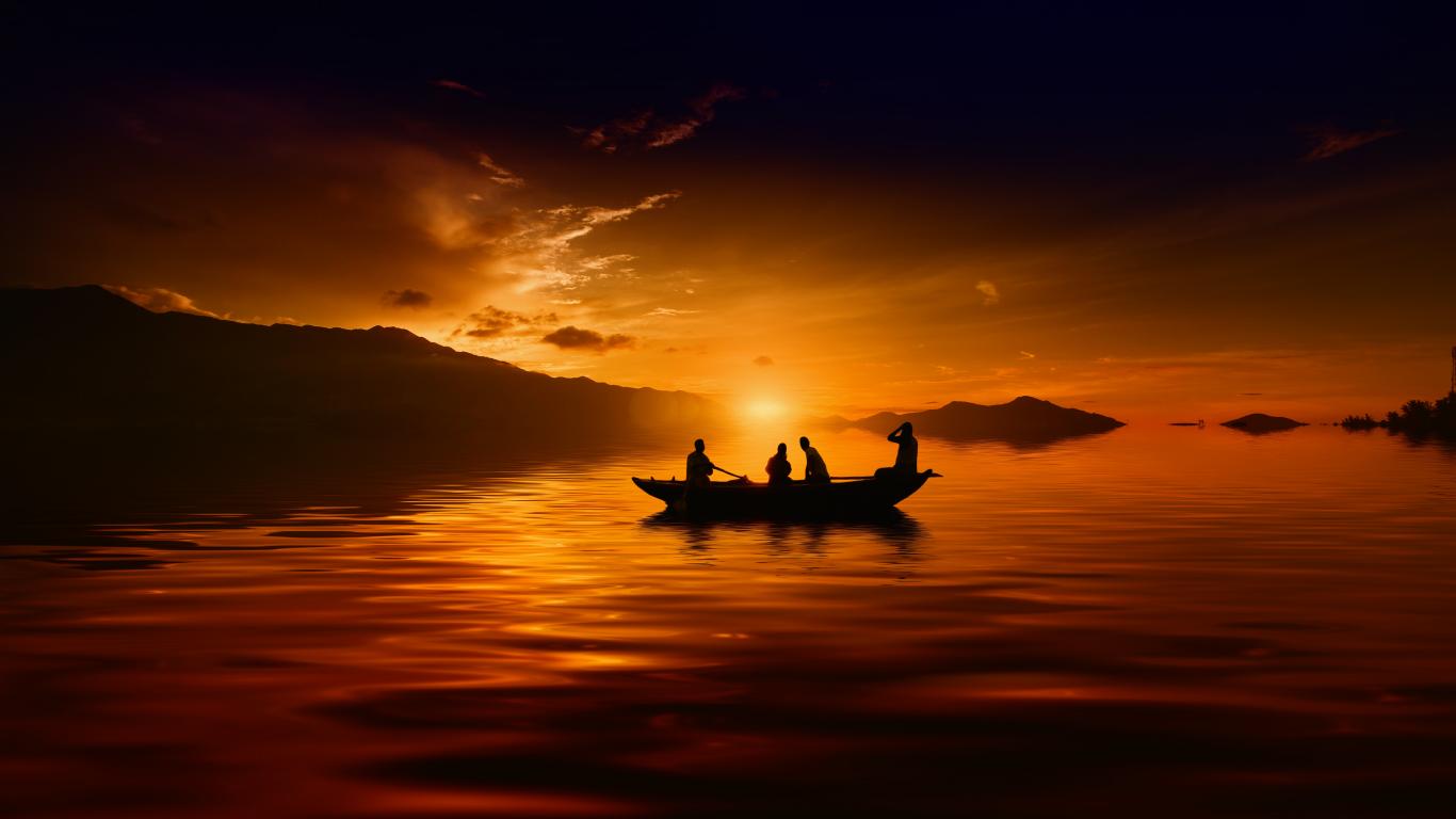 Обои Лодка с людьми на озере на закате