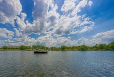 Обои Лодка в озере на фоне гор под голубым небом