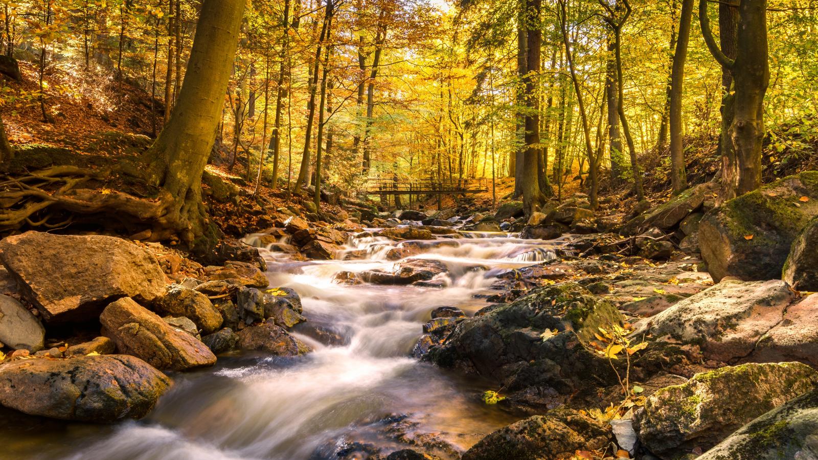 Обои Быстрая вода ручья стекает по камням в осеннем лесу