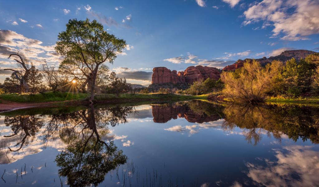 Обои Яркое солнце пробивается сквозь деревья у пруда