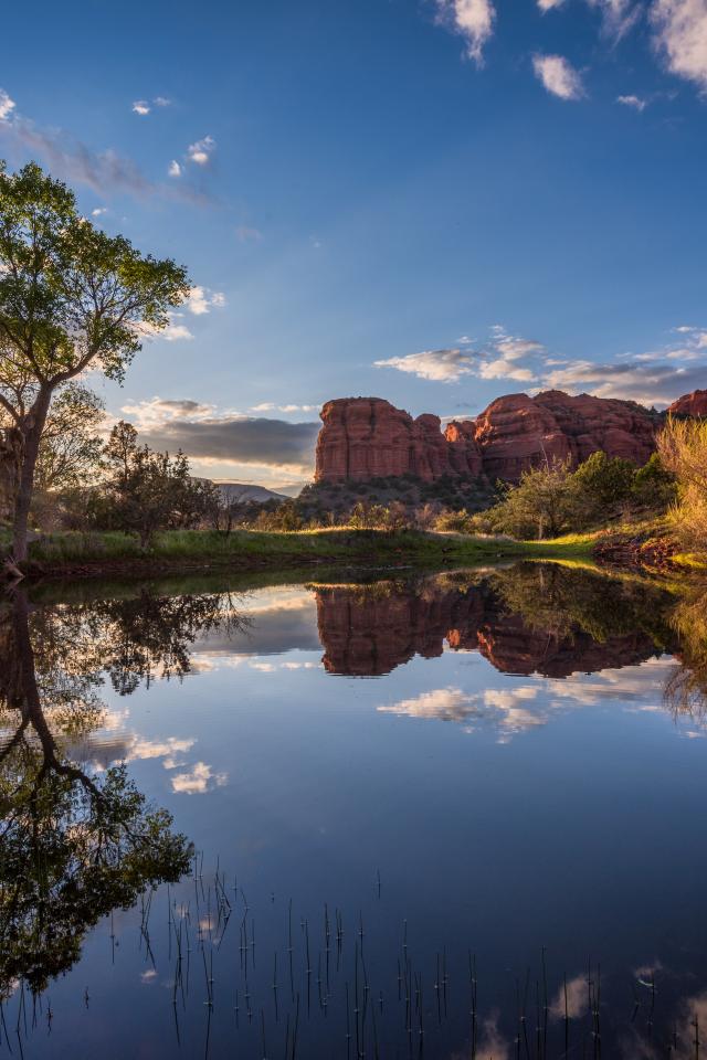 Обои Яркое солнце пробивается сквозь деревья у пруда
