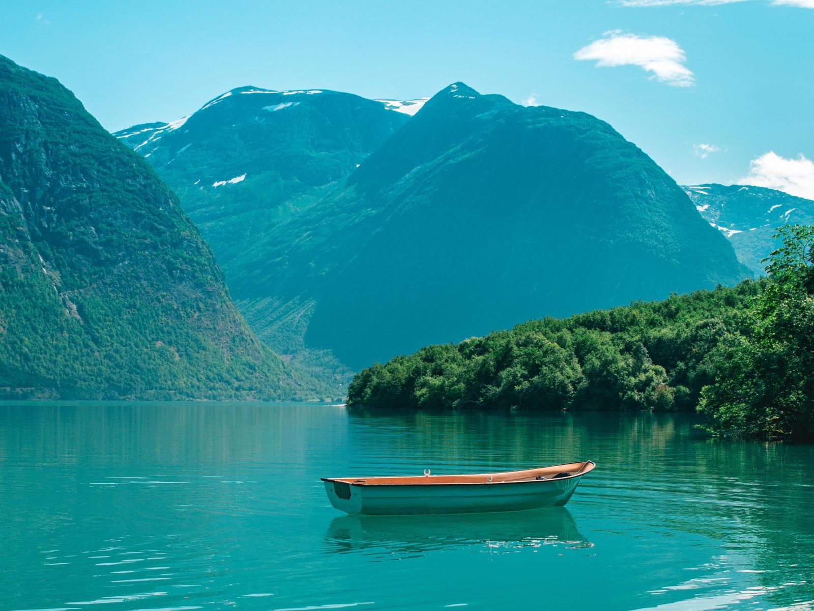 Обои Лодка в воде озера в горах
