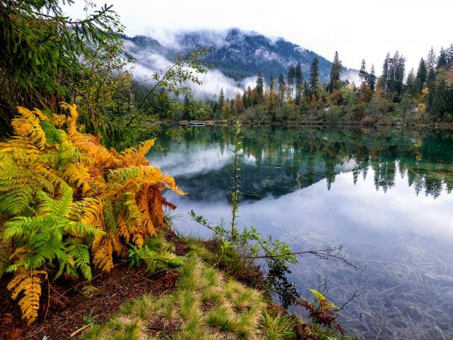 Обои Туман покрывает горы у спокойного озера на рассвете
