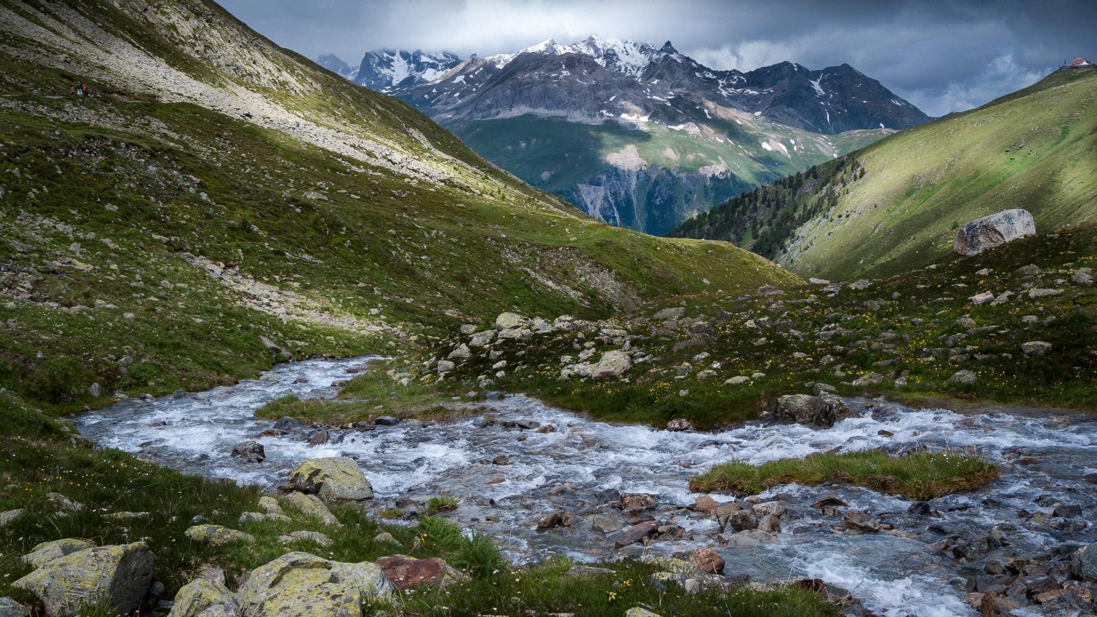 Обои Быстрая горная река протекает между горами
