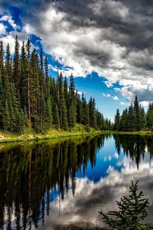 Обои Высокие сосны на берегу озера под темными грозовыми облаками