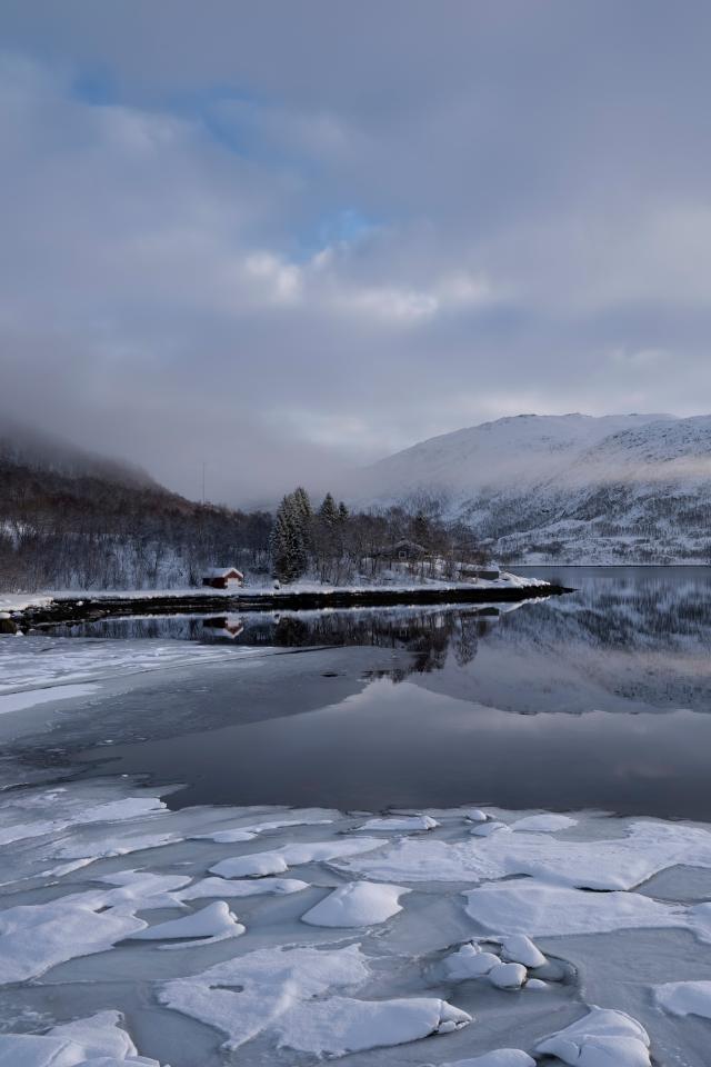 Обои Покрытое льдом холодное озеро у гор в тумане