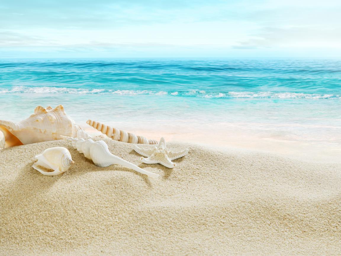 Обои Ракушки на белом песке на побережье у моря
