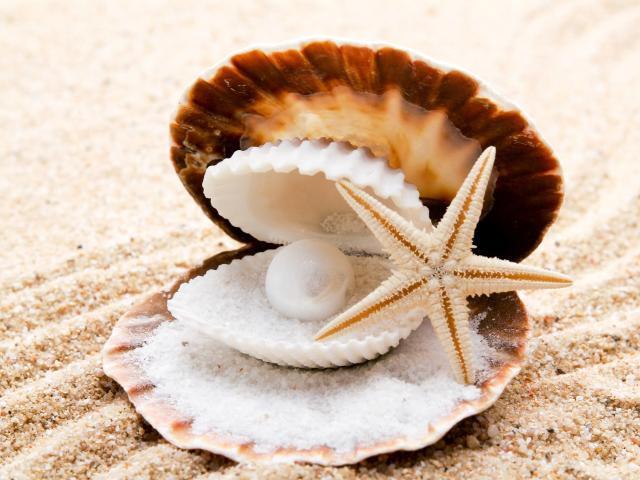 Обои Ракушка с жемчужиной и морская звезда на белом песке у моря