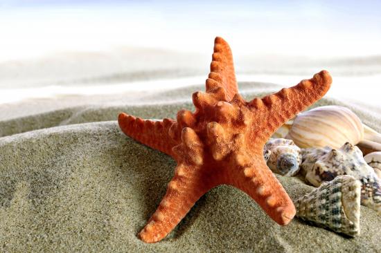 Обои Морская звезда и ракушки на песке крупным планом