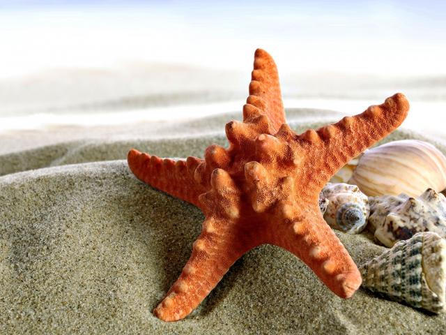 Обои Морская звезда и ракушки на песке крупным планом
