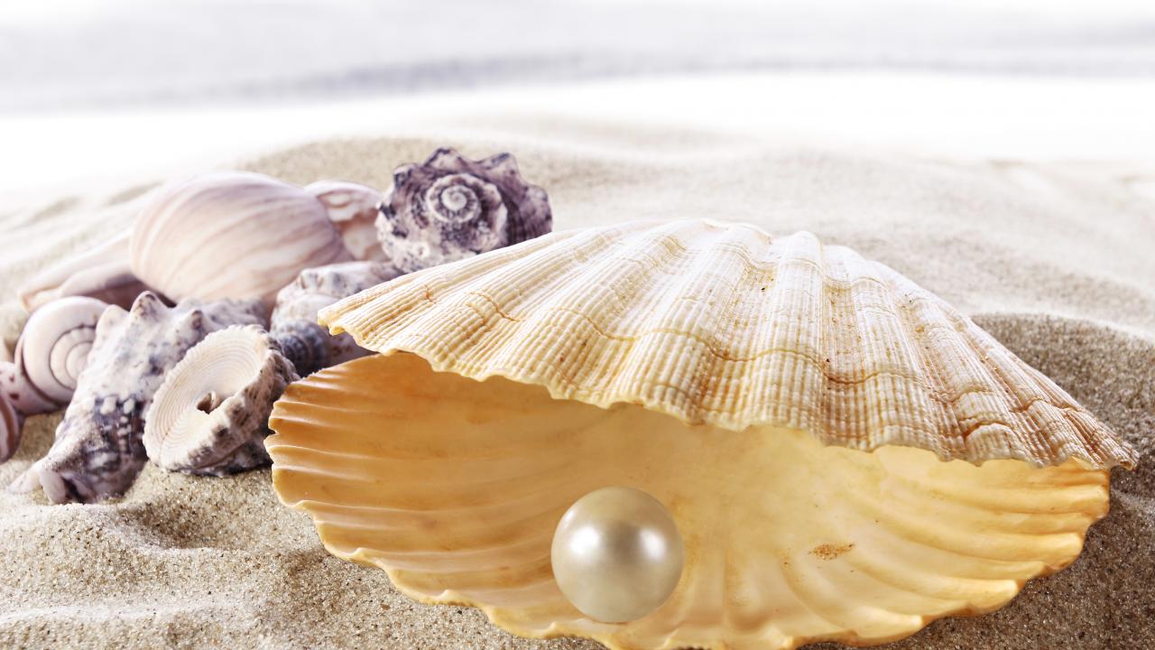 Обои Разные ракушки с белой жемчужиной на желтом песке
