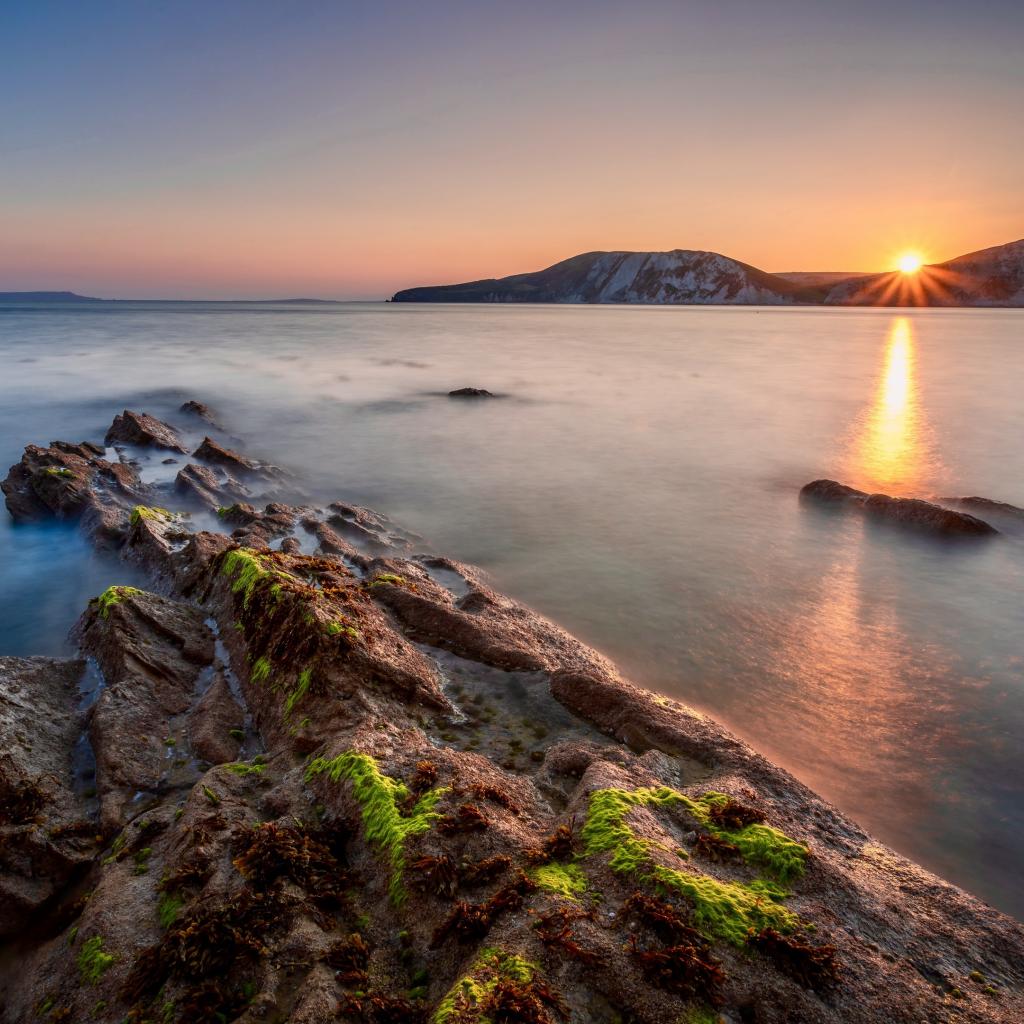 Обои Спокойная вода в море с подводными камнями на закате