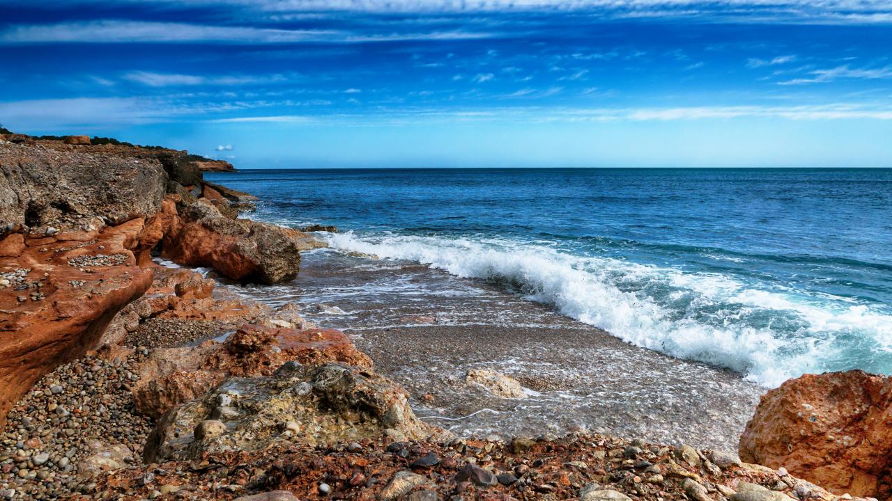 Обои Белые волны на берегу моря с большими камнями под голубым небом