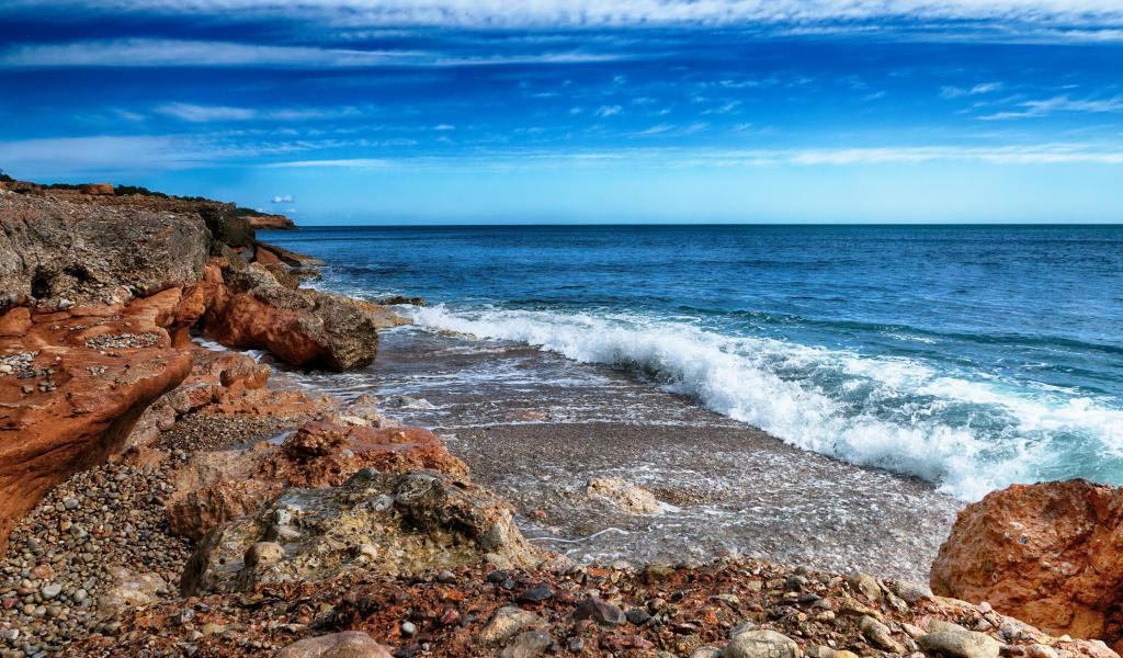 Обои Белые волны на берегу моря с большими камнями под голубым небом