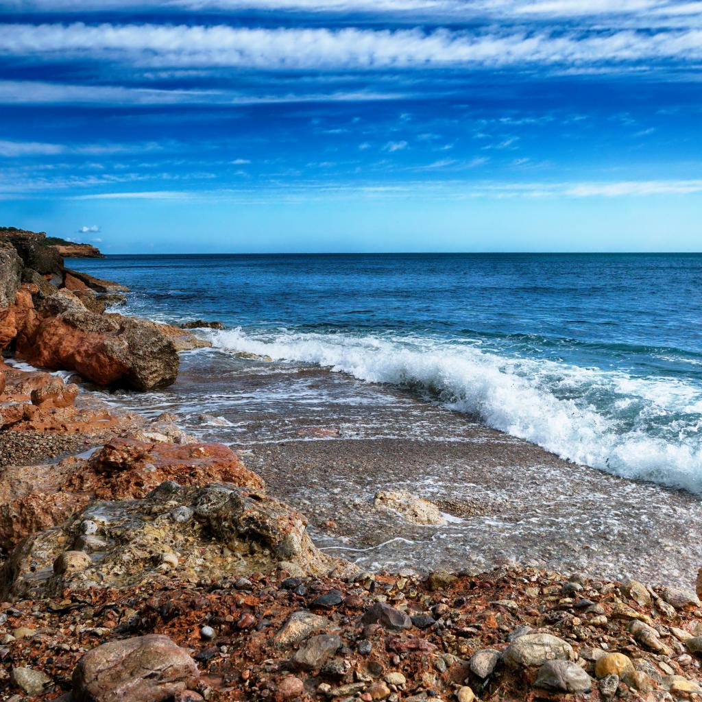 Обои Белые волны на берегу моря с большими камнями под голубым небом