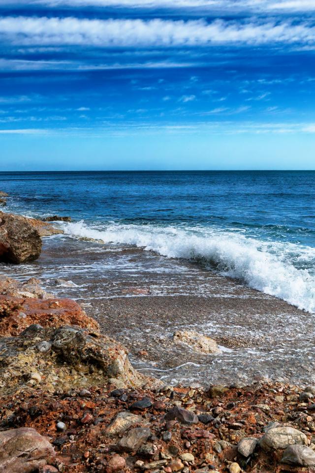Обои Белые волны на берегу моря с большими камнями под голубым небом