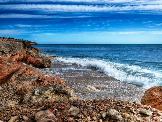Обои Белые волны на берегу моря с большими камнями под голубым небом