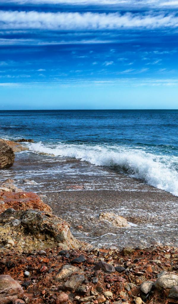 Обои Белые волны на берегу моря с большими камнями под голубым небом