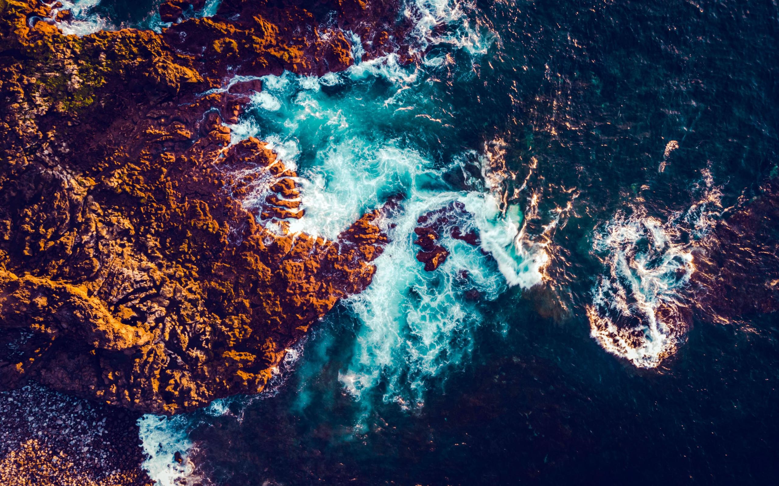 Обои Белые морские волны бьются об камни, вид сверху