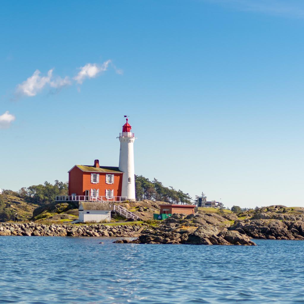 Обои Маяк на каменном берегу моря под голубым небом