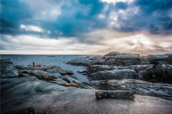 Обои Каменный берег у тихого моря под черными облаками