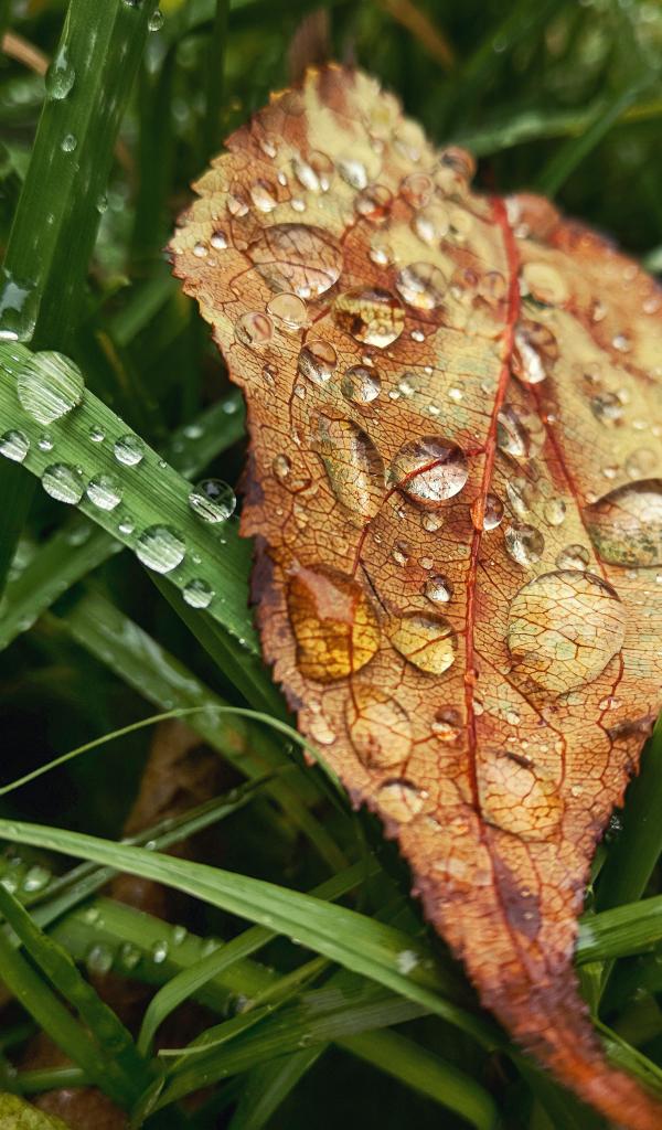 Обои Желтый осенний лист в зеленой траве в каплях дождя