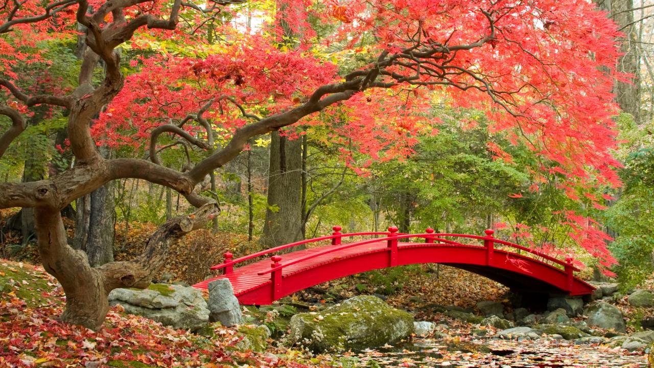 Обои Красный мост в осеннем парке у покрытого красными листьями дерева
