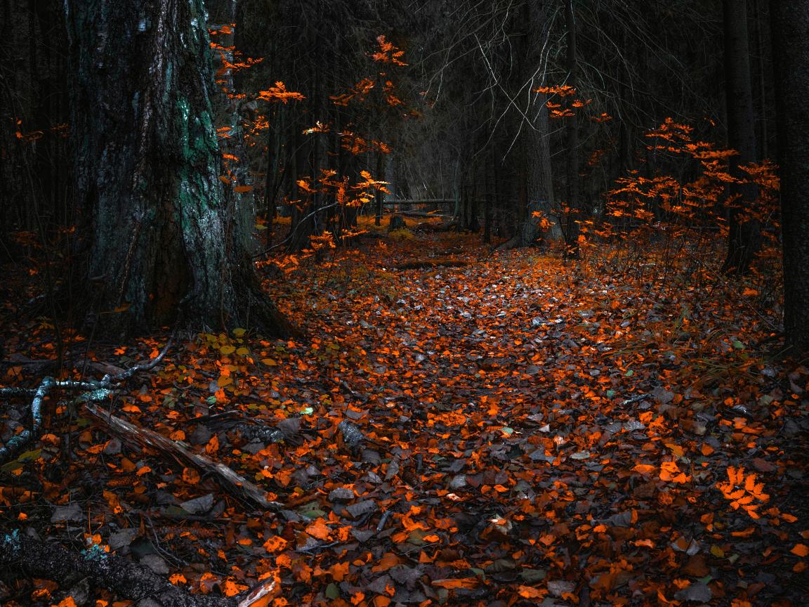 Обои Желтые опавшие листья в холодном осеннем лесу