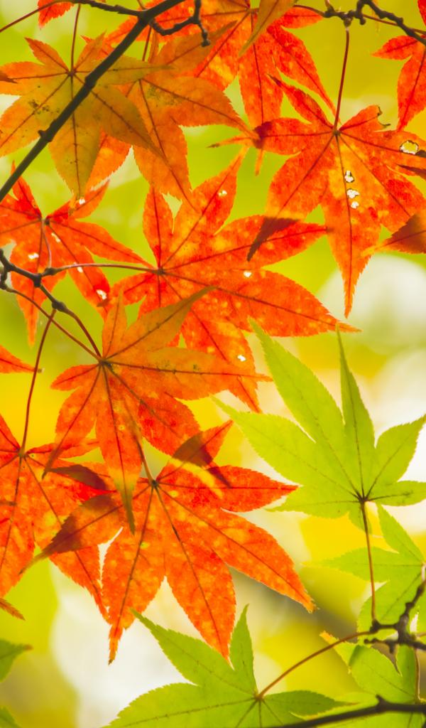 Обои Зеленые и оранжевые листья на ветках осенью
