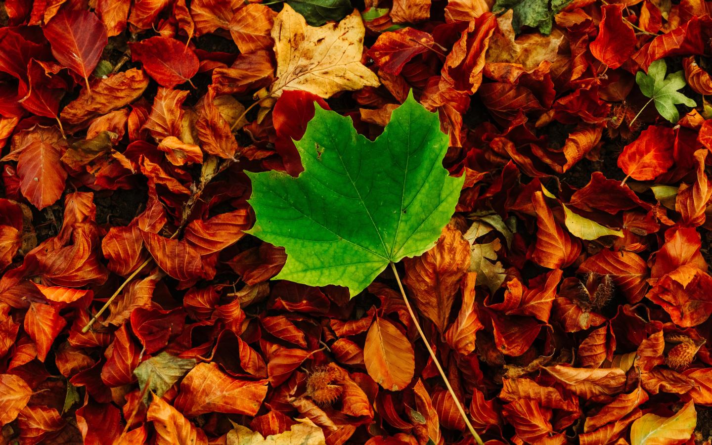 Обои Зеленый кленовый лист лежит на сухой листве