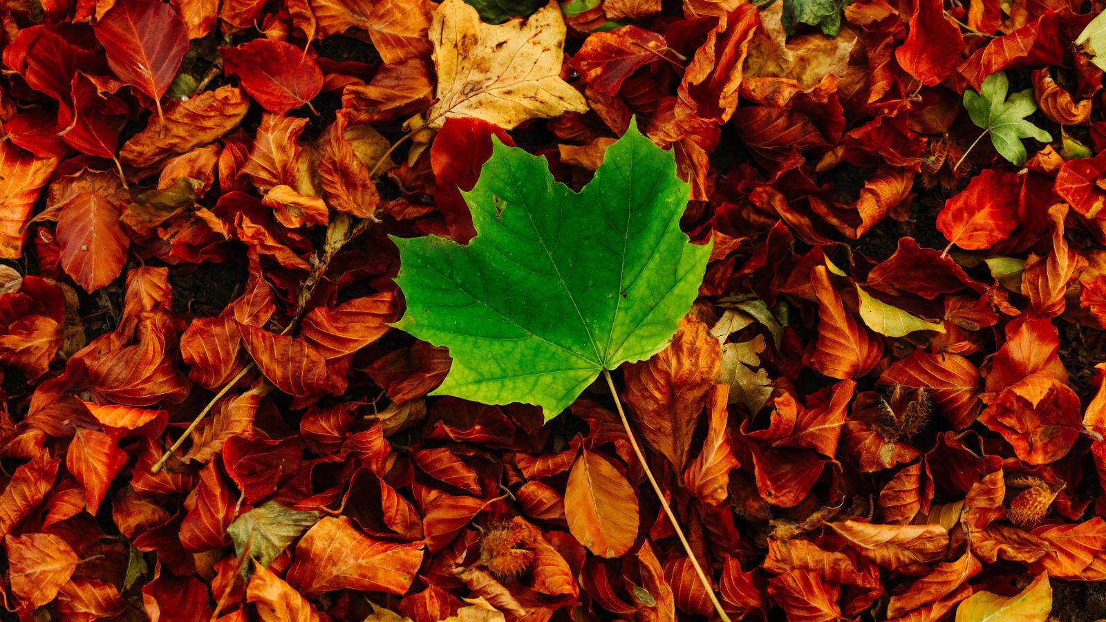 Обои Зеленый кленовый лист лежит на сухой листве