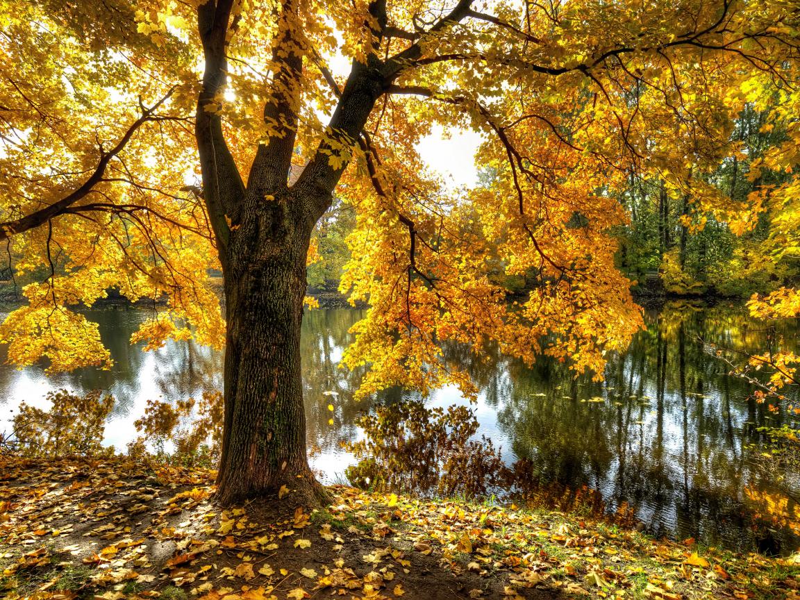 Обои Большое высокое дерево у пруда в парке осенью